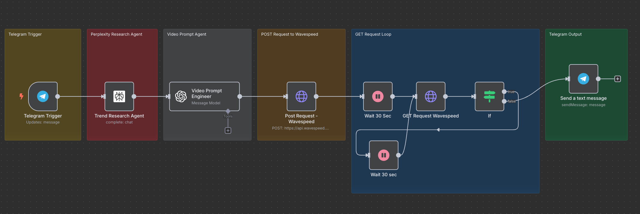 Automates trend discovery from Telegram, converts insights into video prompts, and delivers ready videos via Wavespeed—ideal for instant trend-to-video creation.